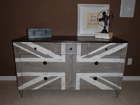 I used CeCe Caldwell's Seattle Mist and Simply White and sealed with Annie Sloan's clear wax.  The top was stripped and stained with dark walnut and the pulls were from another piece.  As much as I like the red, white, and blue Union Jacks I really love the ones done in more neutral colors.